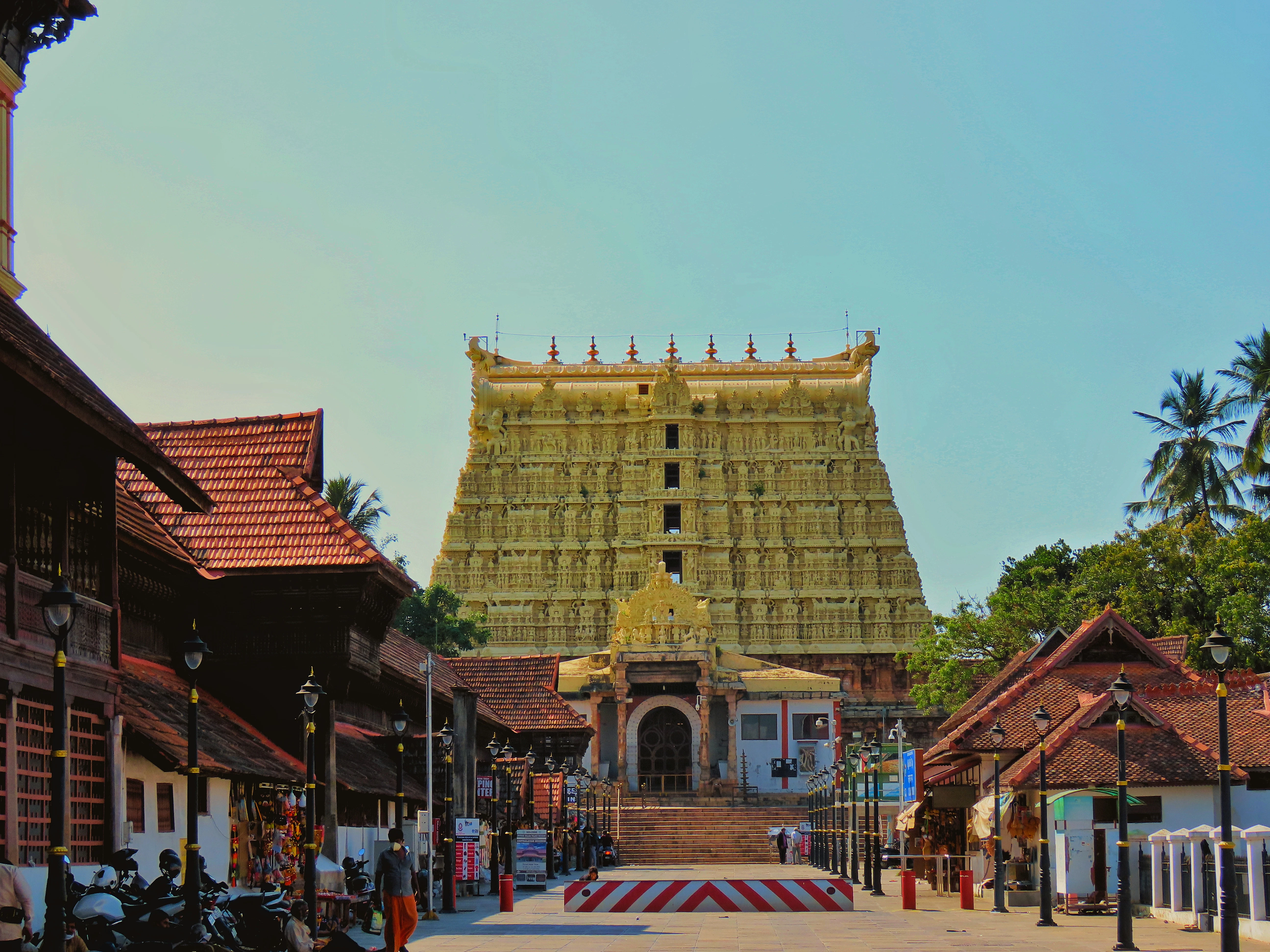 Padmanabhaswamy-Tempel — nur Hindus dürfen hinein. Männer müssen Dhoti (Wickelrock) tragen, Frauen Sari oder Salwar.