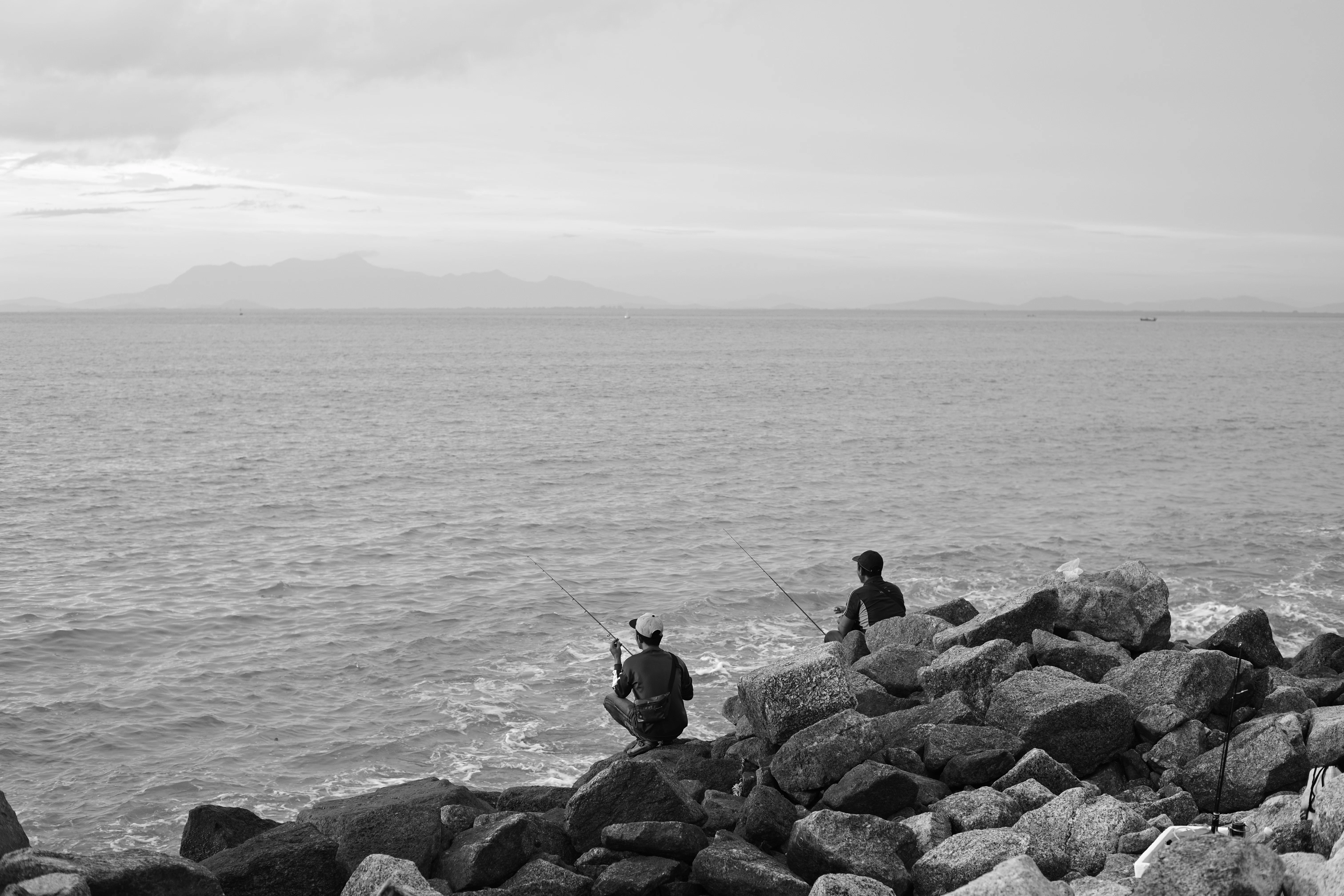Two people are fishing by the ocean.