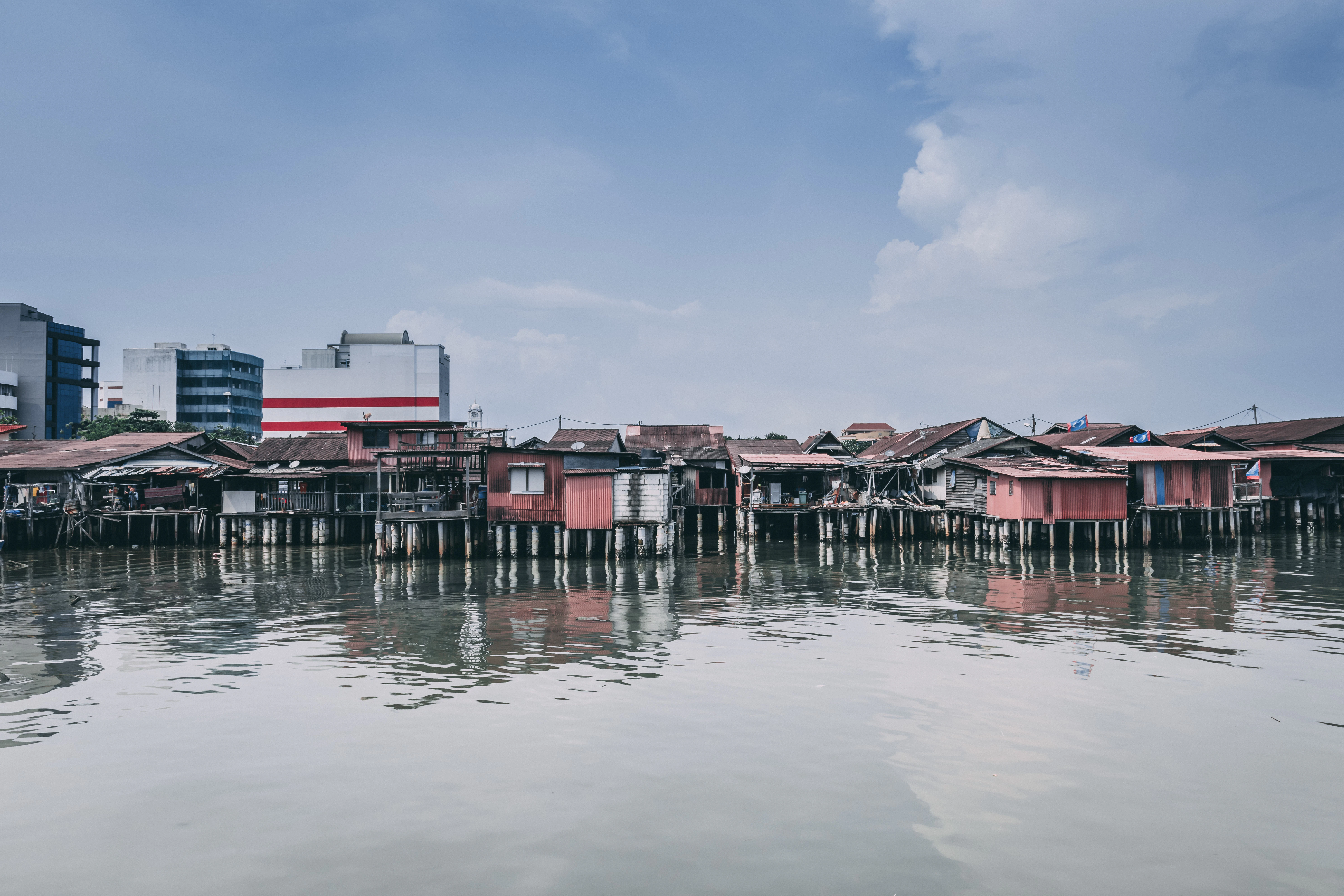 brown and pink houses surrounded by water at daytime