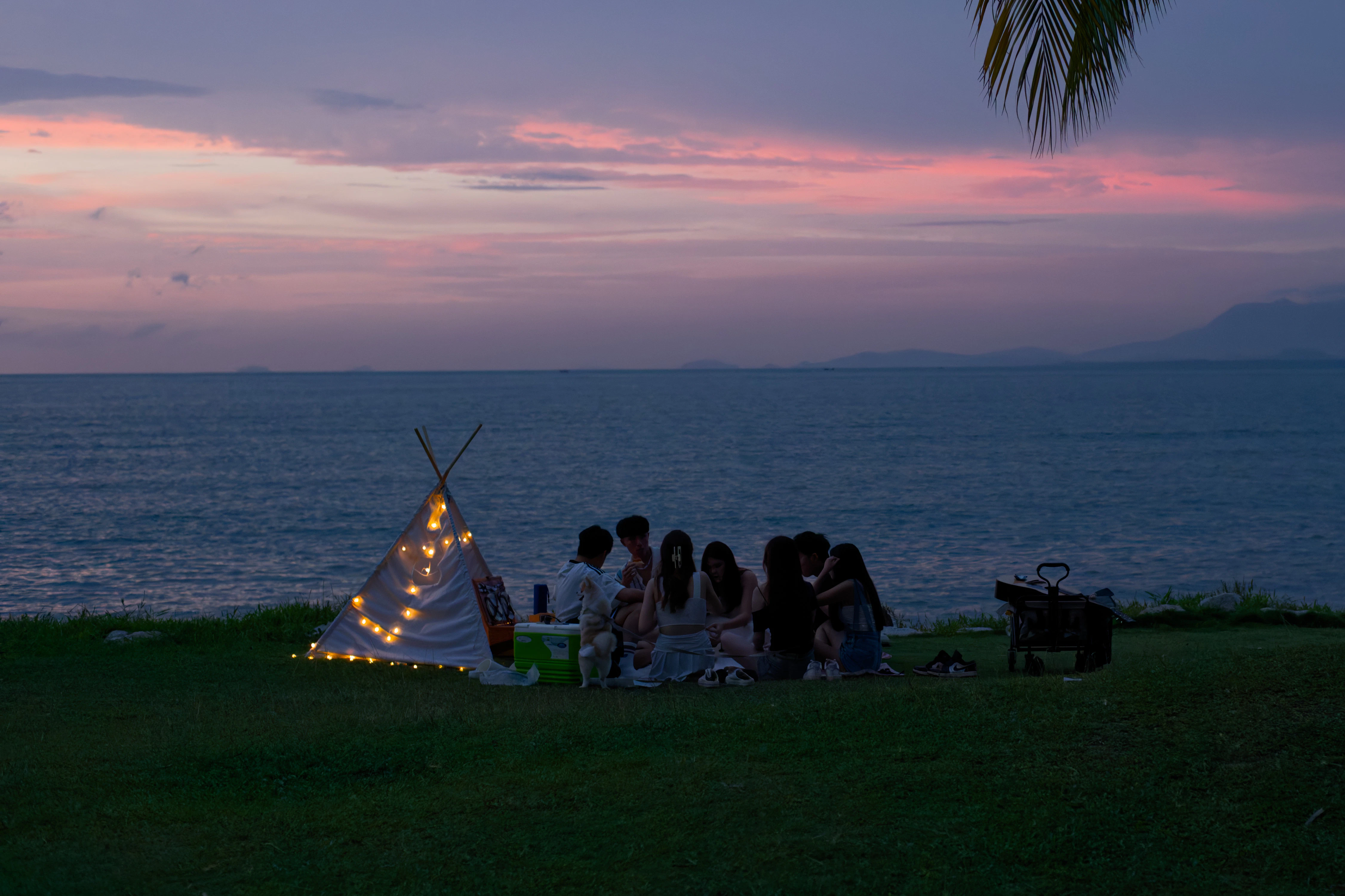 Friends enjoy a sunset picnic by the sea.