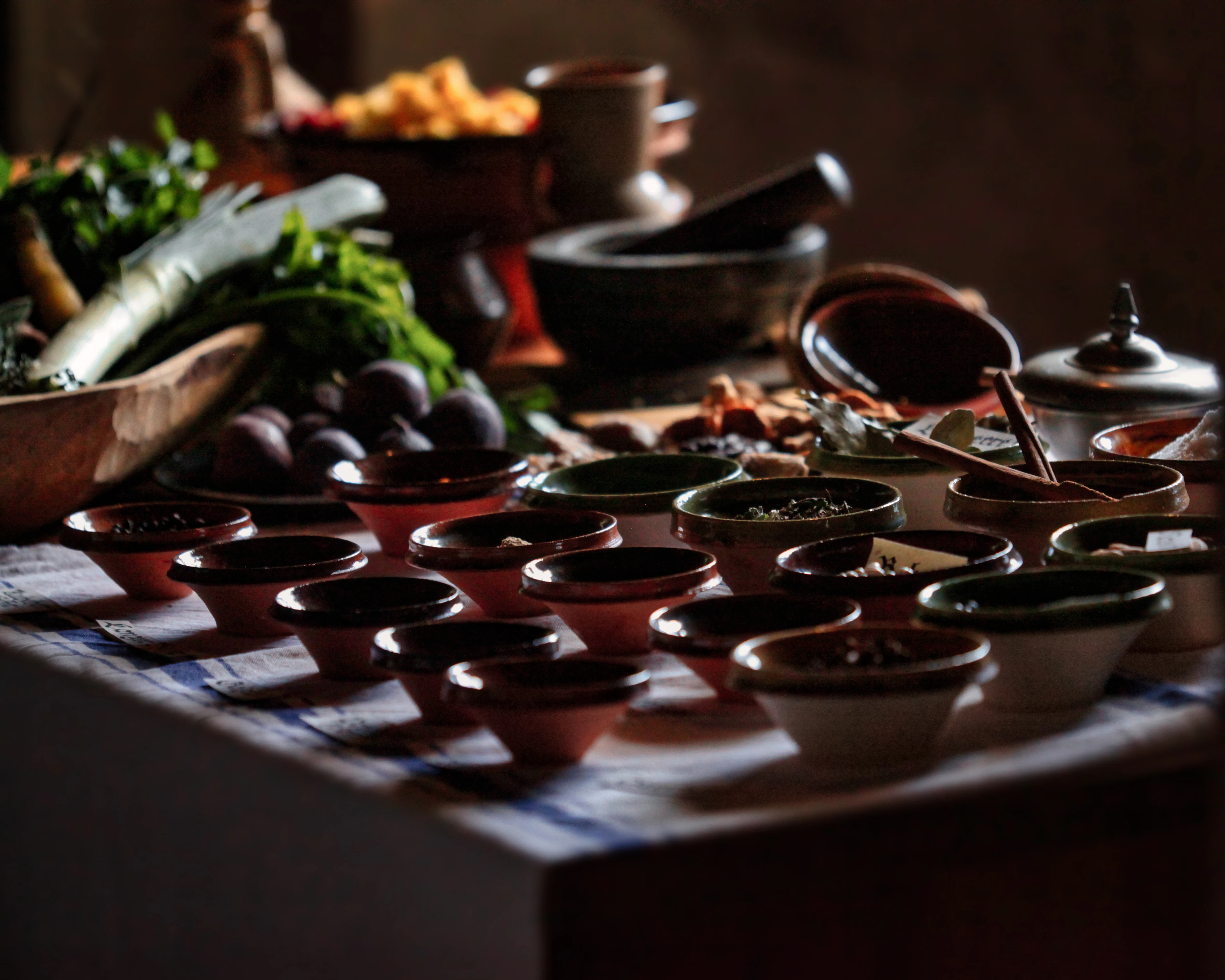 brown ceramic bowls on white and blue checkered table