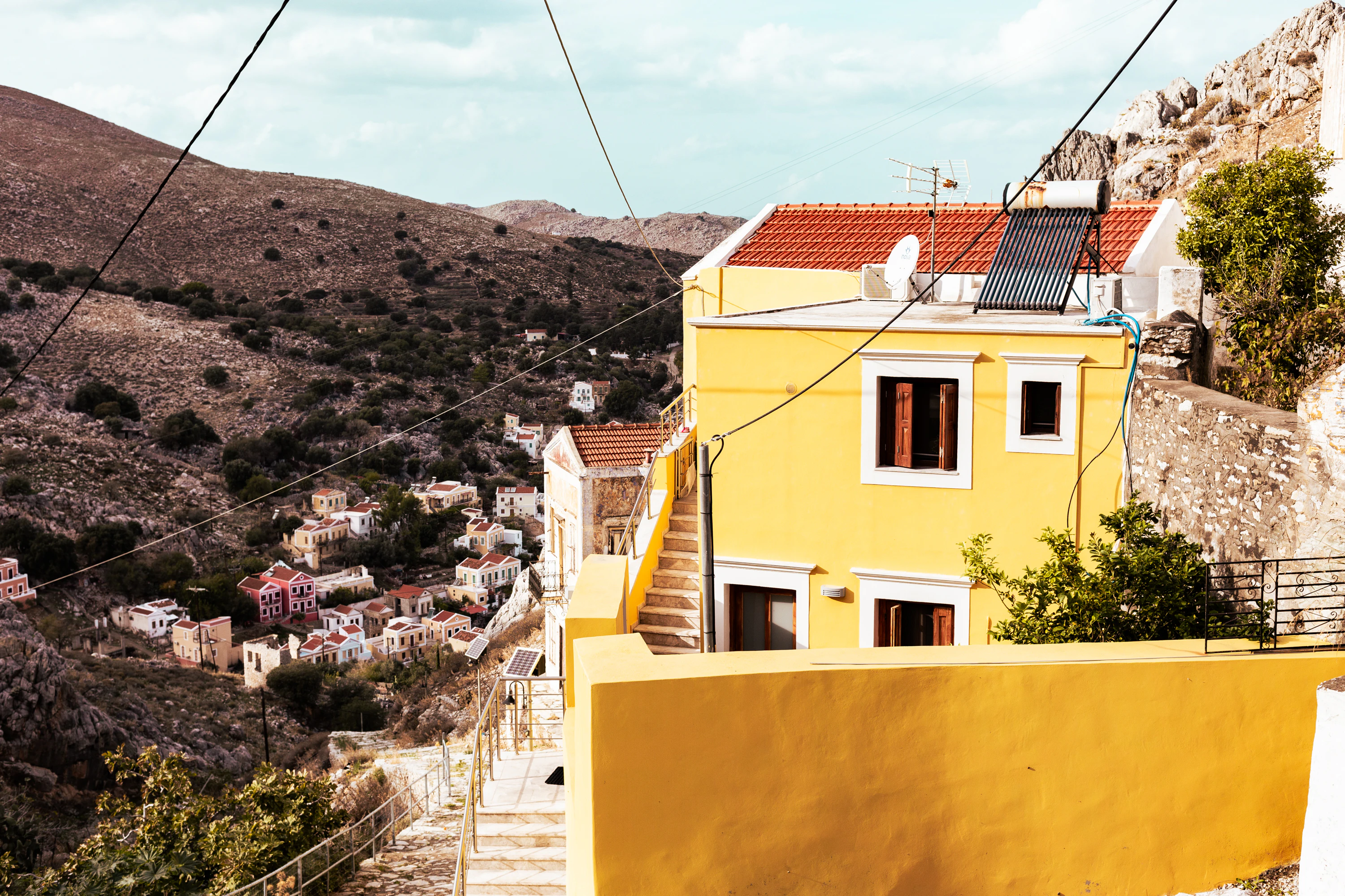 a yellow building with a red roof next to a hillside