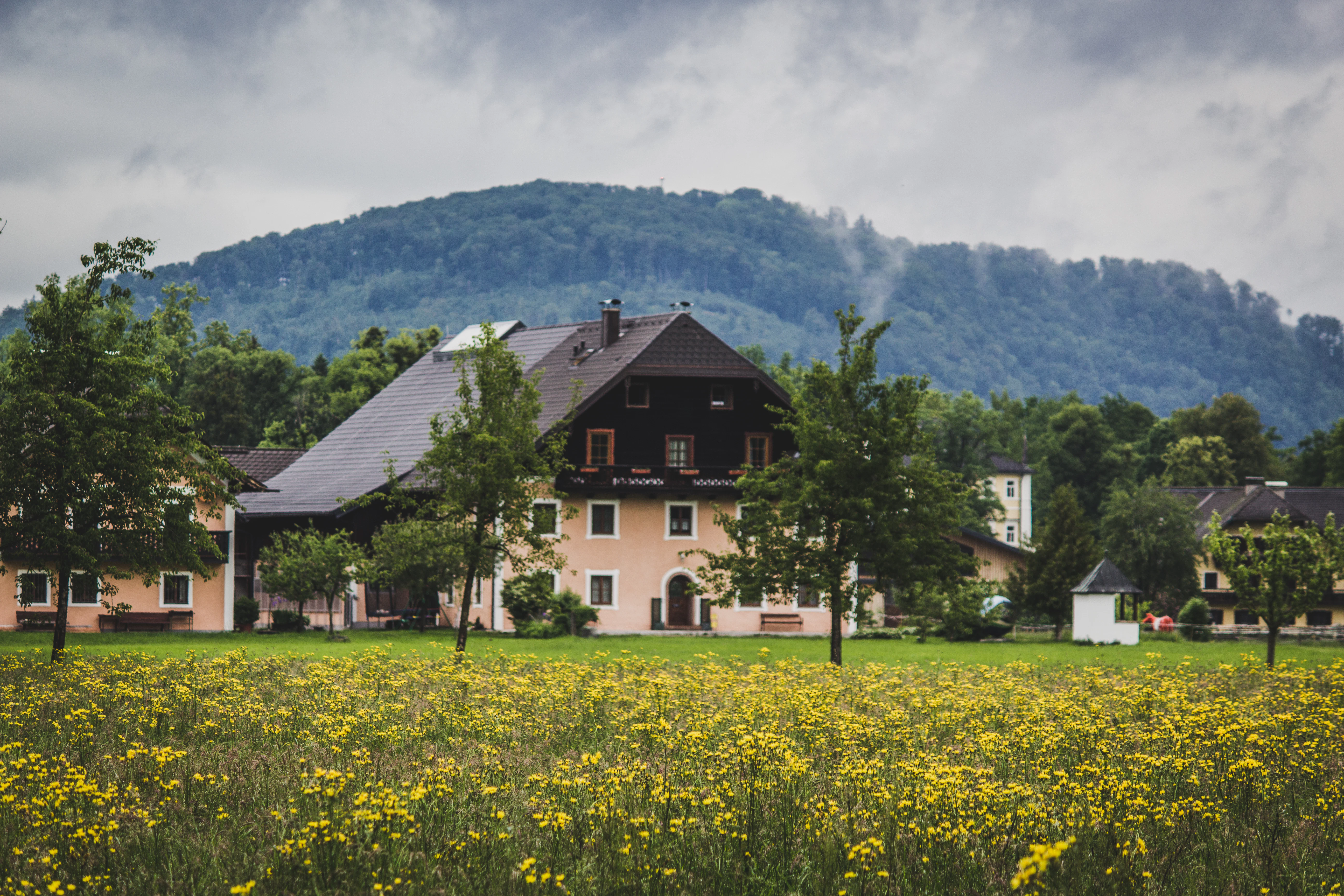 a house in the middle of a field with mountains in the background