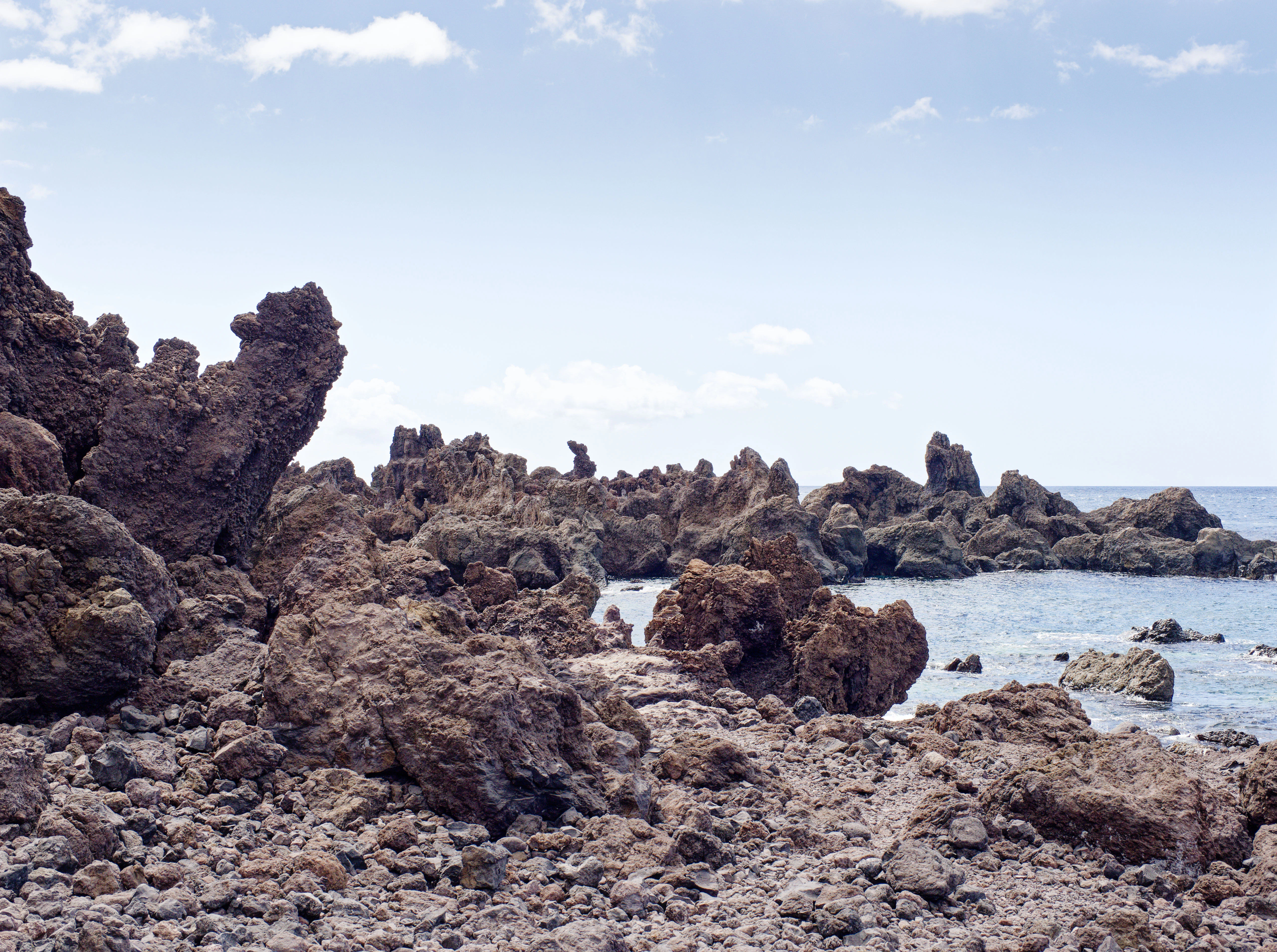 Jagged volcanic rocks line a rocky coastline with calm ocean.
