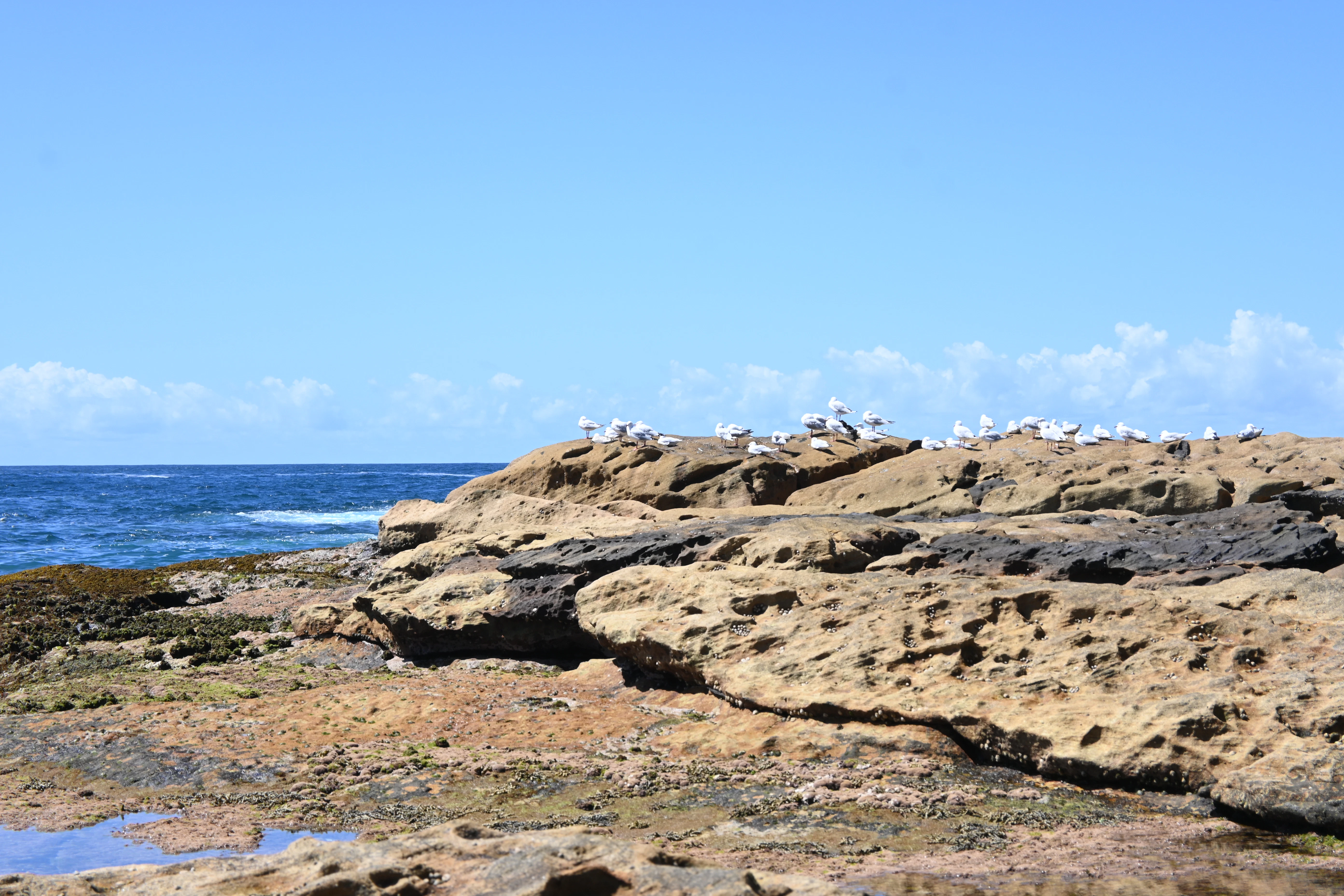 A group of birds sitting on top of rocks near the ocean