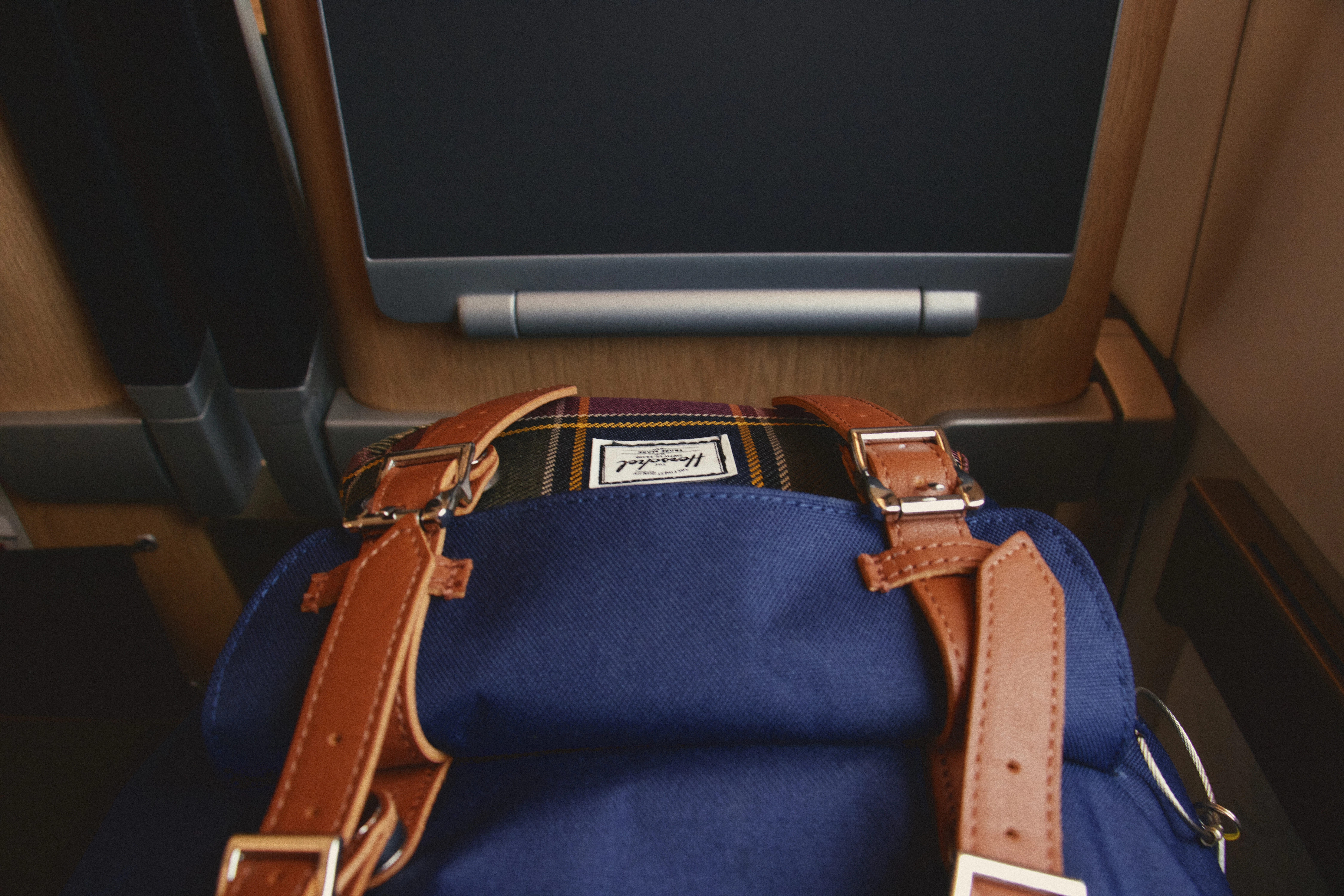 a blue bag sitting on top of a wooden table