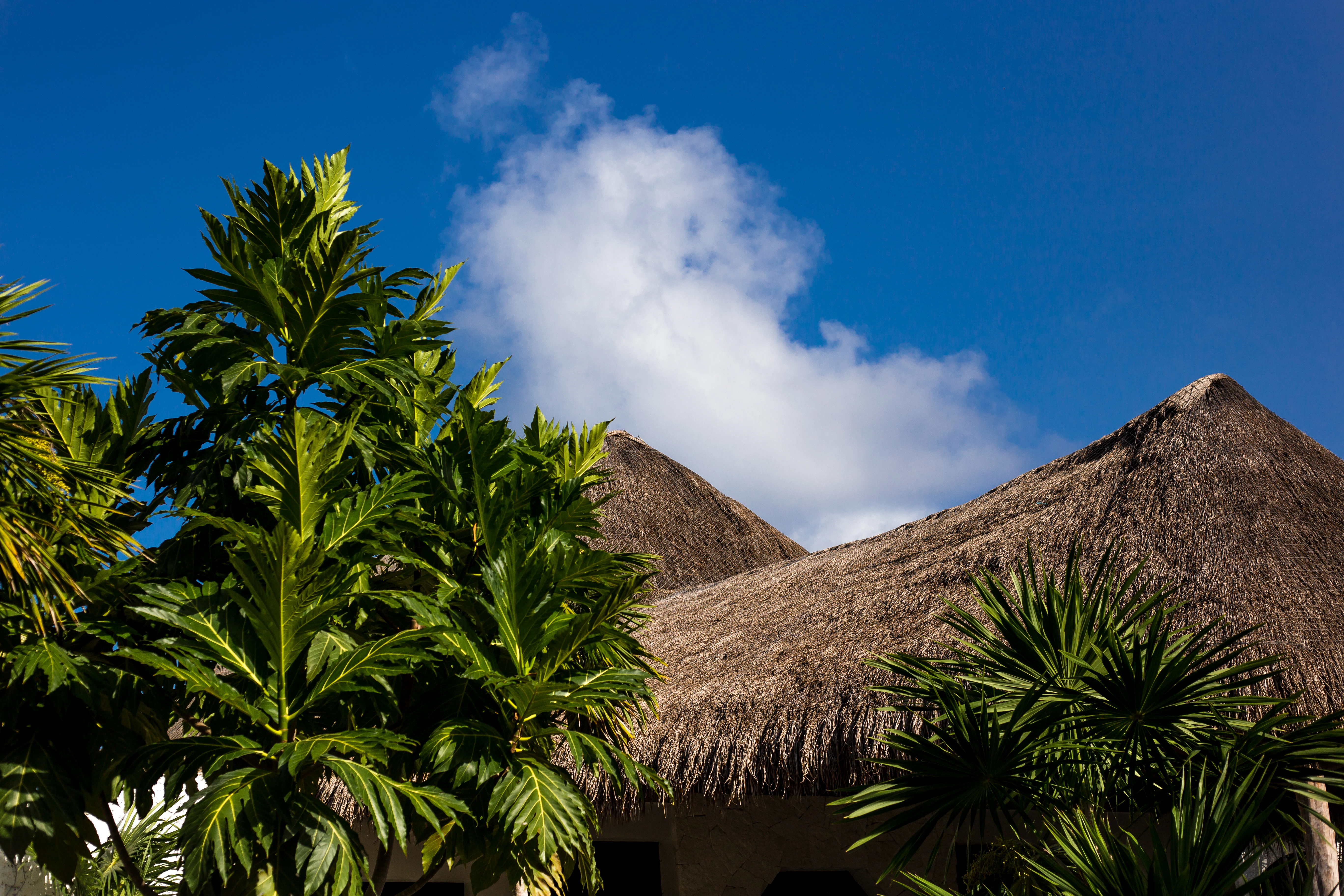 low-angle photography of nipa hut beside tree under cloudy sky