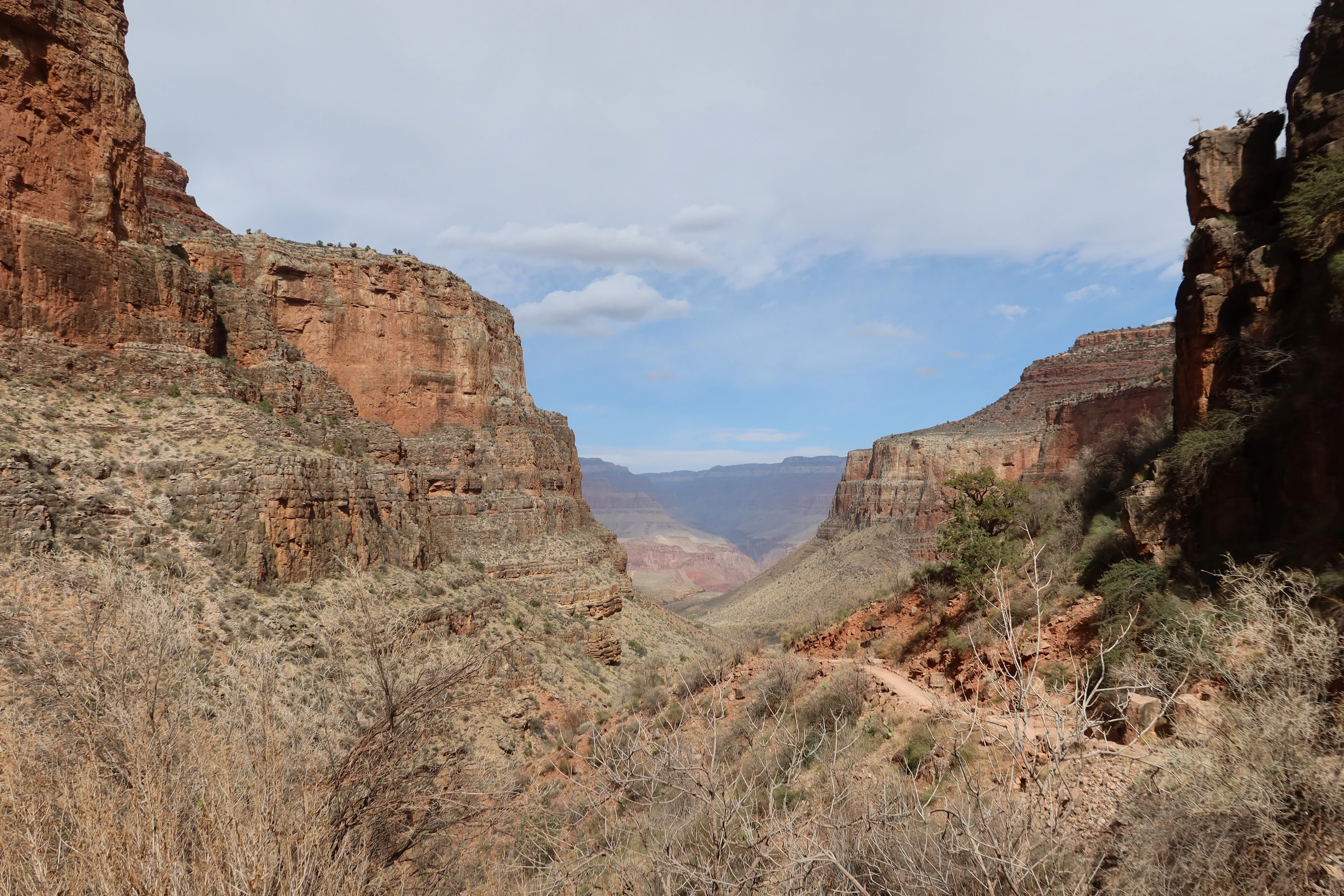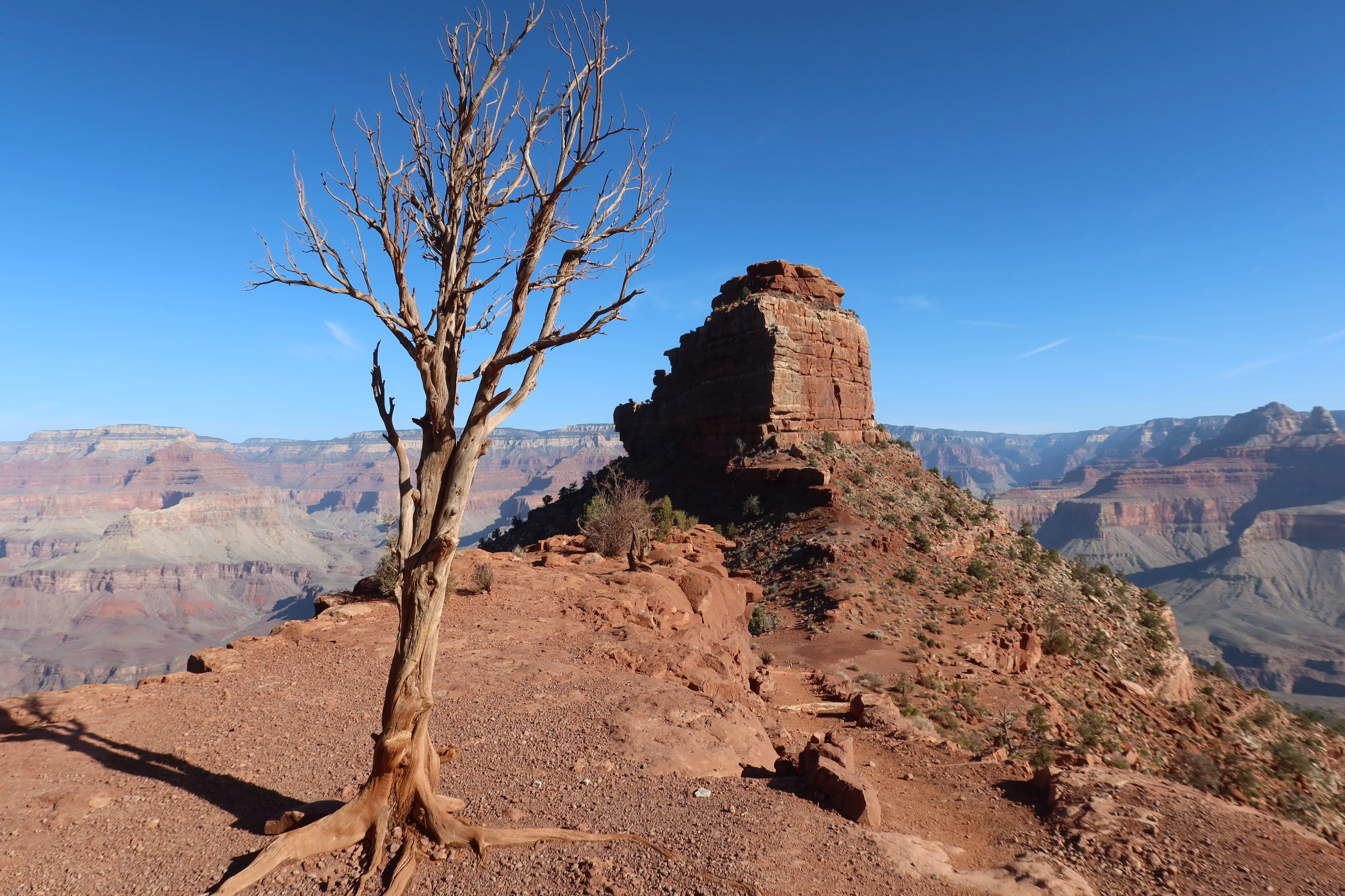 Hikers traverse a scenic trail overlooking the grand canyon.