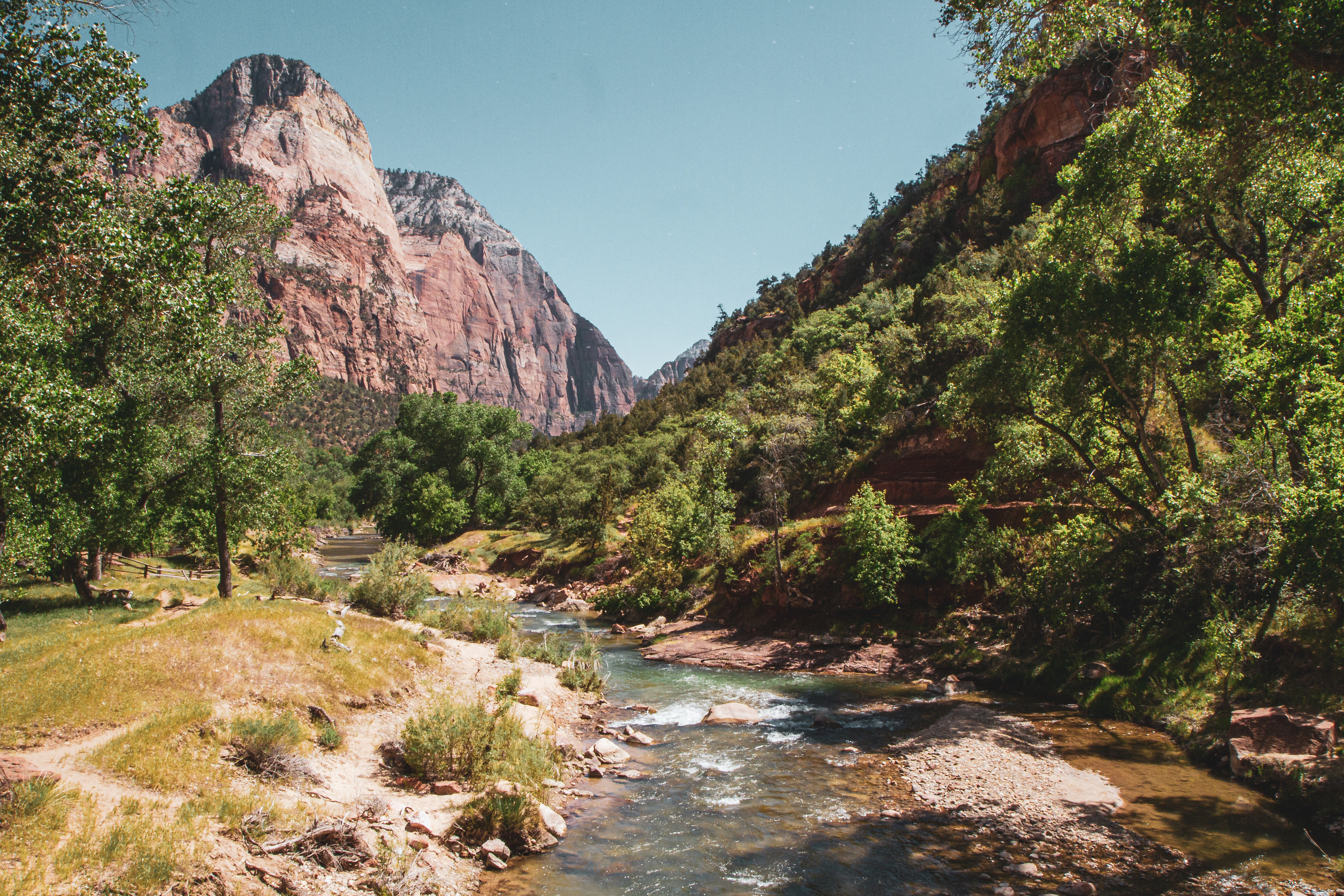 Der Zion Nationalpark in Utah ist ein geologisches Meisterwerk aus tiefen Schluchten, gewaltigen Sandsteinklippen und dem smaragdgrünen Virgin River, der sich über Millionen Jahre durch 600 Meter hohe Wände aus rotem Navajo-Sandstein gefressen hat. Der Park gehört zu den dramatischsten Naturlandschaften der USA und zieht jährlich über vier Millionen Besucher an. Der Angels Landing Trail ist einer der berühmtesten Wanderwege Amerikas: Der letzte Abschnitt führt über einen schmalen Felsgrad mit Ketten als Handlauf und 450 Metern Abgrund zu beiden Seiten — nichts für Leute mit Höhenangst, aber die Belohnung ist ein 360-Grad-Panorama, das seinesgleichen sucht. Seit 2022 braucht man ein Permit (Lotterie), also früh planen. The Narrows ist das Kontrastprogramm: Hier wandert man direkt im Virgin River durch die engste Stelle des Zion Canyon, wo die Wände nur wenige Meter auseinander und über 300 Meter hoch sind. Je nach Wasserstand reicht das Wasser von knöcheltief bis hüfthoch — Neoprensocken und ein Wanderstock sind Pflicht. Der Scenic Drive durch den Zion Canyon ist von März bis November nur per Shuttle erreichbar, was den Park angenehm autofrei hält. Der weniger besuchte Kolob Canyons District im Norden bietet Einsamkeit und einen der größten natürlichen Felsbögen der Welt. Springdale am Parkeingang ist ein charmantes Städtchen mit guten Restaurants und Unterkünften.